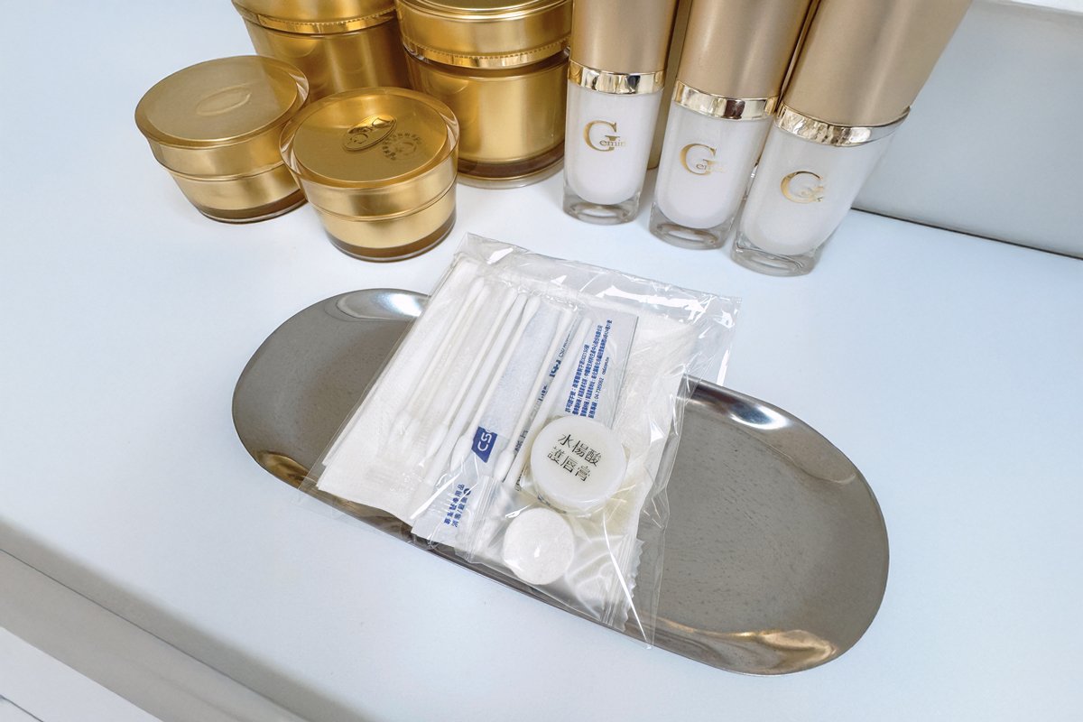 全程採用拋棄式衛生耗材,提供「一人一式護理包」,內含獨立包裝棉花棒、拋棄式洗臉巾、酒精棉片、水楊酸護唇膏與唇棒,使用更安心。
